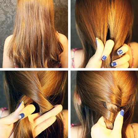 先将你所有头发拨向背后,用梳子打理一下,然后分割出发顶的头发,先将这部分的头发一分为二,将两个发束交叉层叠在一起,接着从左边的头发中取出一小束头发加入右边的发束上,开始编发。