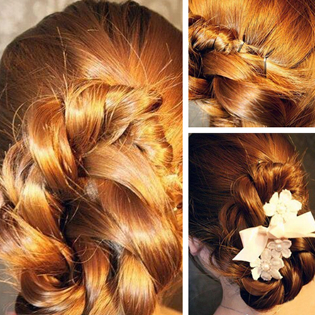 接着,我们先将辫子拉扯得蓬松一些,再将辫子缠绕盘起,记住要将发尾藏在盘发内层,随即用发夹固定好盘发,最后戴上与你礼服配套的头饰即可。