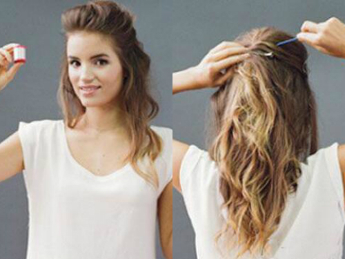 将一头卷发打理整洁后,我们可将发顶与两侧的头发聚在一起,使用发夹将其固定在脑后。