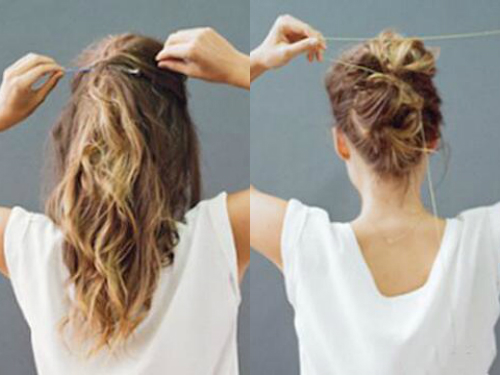 在这个过程中,你还可以将你喜欢的发饰固定在盘发上,之后将鱼线打结,剪去多余部分就可以了。
