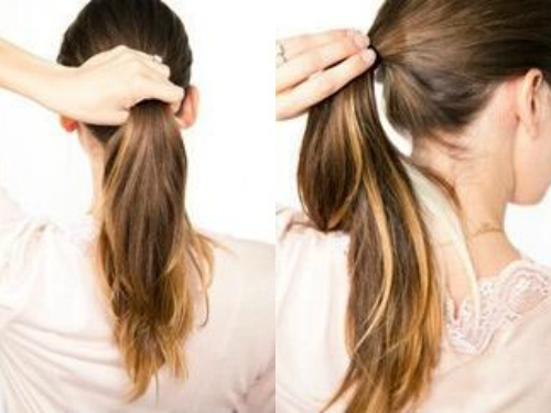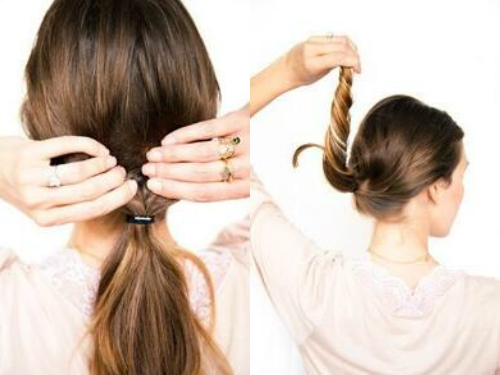 把橡皮筋往下移一些,并用两手将橡皮筋对上的头发拉扯得蓬松一些,然后用手拉着马尾的末端,不断旋转马尾。