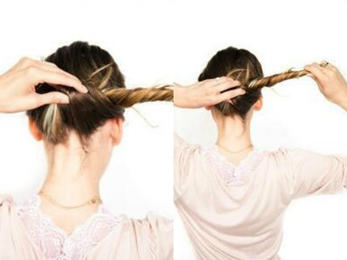 将马尾拉向一侧后继续旋转,让头发变得紧绷一些,形成图中的圆锥形。