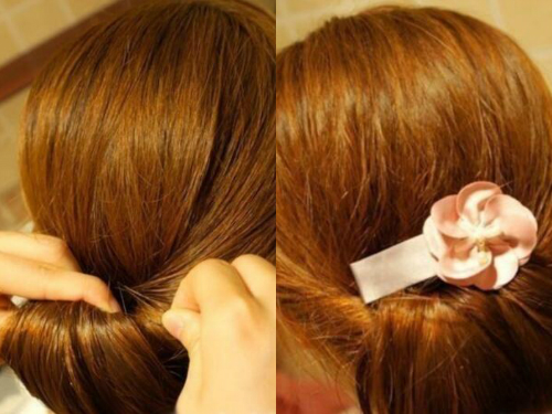 将马尾盘成一个低发髻,使用多个发夹固定好发髻与马尾的接口,之后再用漂亮的头发别在发髻上,即可固定发髻与遮挡发型的空隙。