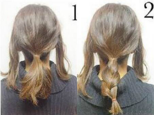 首先打理一下头发,然后将头发分成如图1所示的三部分,将中部头发扎成马尾,然后编成一条饱满的麻花辫,使用橡皮筋固定好。