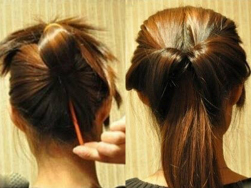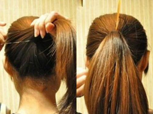 将隐形盘发器尾部往右边旋转,拉向下方,这时候你的马尾就会翻转向上。然后调整一下马尾,拉出隐形盘发器,将马尾从上往下穿进马尾根部的中部,效果如右图所示。