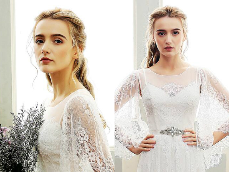 同是一款简约的公主头盘发发型,轻薄的空气刘海修剪衬托得女生的脸蛋越发精巧,整个人也显得大方清丽,背后的头发全部盘成一个低发髻,不加任何发饰看起来依然端庄优雅,露肩的婚纱设计把新娘性感的锁骨展露无遗,手拿洁白的捧花看起来就像个不食人间烟火的仙女。