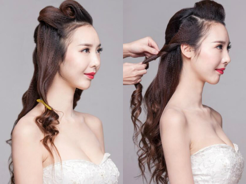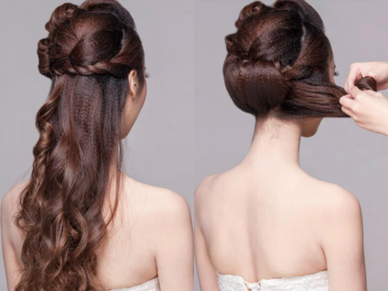把拧好的发辫围绕后脑勺一圈后固定在之前倒梳好卷起来的盘发旁边,最后把剩下的头发一一进行倒梳打毛,在以卷筒的法式逐一固定在枕骨下。