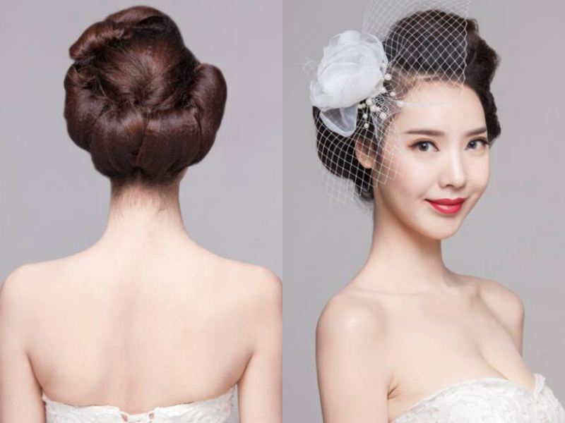 最后基本的法式盘发就完成了,整个造型看上去整齐利落,发丝全部都梳理得一丝不苟,在前左侧别上一朵白色的网纹头饰,顿时变得高贵优雅了,不管出席宴会还是婚礼等正式场合,都是非常合适的哦!