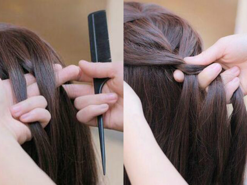 把长发梳理好,两边都留出一部分头发放着,在发顶的中间取一束头发并分成三小束,然后按照编麻花辫的方法开始编,在编发的过程中不断的从两边挑少量的发丝加入到发束里,注意每次添加的发量尽可能的一致。