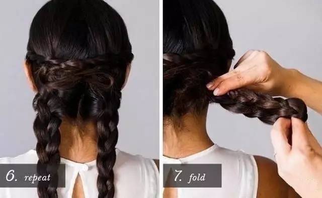 另外一边的长刘海重复以上的步骤,同样的方法打理发辫,使两条发辫重叠在一起固定好,接着开始处理麻花辫,将其中一条麻花辫往上对折,使其重合起来。