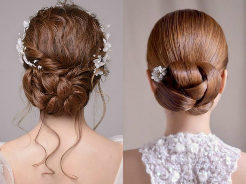 很有造型感的盘发,做个低马尾的盘发,把盘发做成花苞的形状,就像一朵绽放的花,看起来特别迷人,相比整齐一丝不苟的花苞盘发,稍带点慵懒凌乱空气感的花苞盘发更显气质,散落的发丝,不经意间带着点浪漫,加上花朵的装饰,更显女性的美丽。