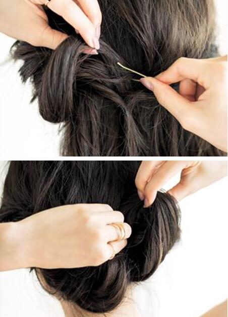 步骤二 在旁边取出一股头发,绕到上面从上往下穿过刚才绑好的发辫,形成一个中空的发髻,再用发夹固定好,重复这样的步骤将下方的头发穿过发辫固定,注意固定时要夹稳一点。