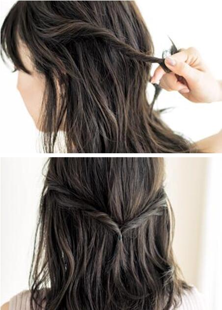 步骤一 首先从耳朵两侧取出两束少量的发丝,然后将它们向内扭转,拧结汇合成一小束好看的发丝,再用橡皮筋绑好,注意绑的时候不要太松也不要太紧。