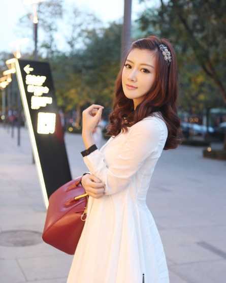 知性甜美的中长发烫发发型,将刘海diy一下,弄一个甜美的发饰,展现出光洁的脸蛋,
