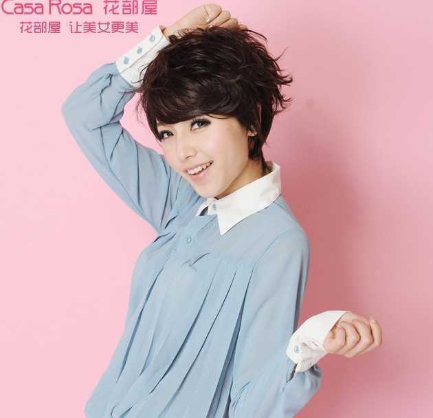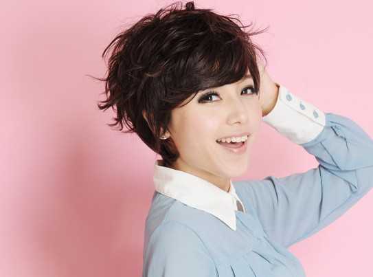 超有人气的一款棕黄色斜刘海定位烫女生短发型,前面的斜刘海不仅有修饰脸型的效果,还显得非常清新动人!顶头上面有些凌乱的定位烫效果相当不错,超帅气的。