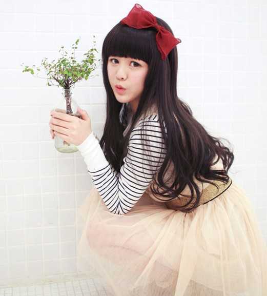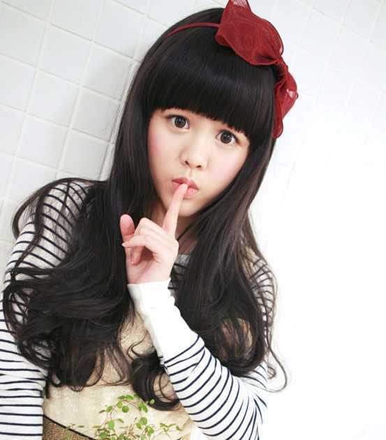 前面的齐刘海给人的感觉真的很甜美,两颊的长卷发看上去很自然,深棕色的发色把脸衬托着很白,超好看的!