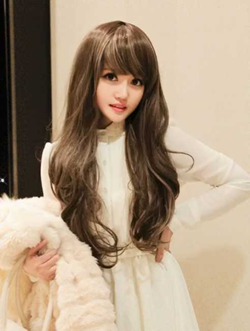 稍斜刘海的长发烫发,透着小公主般的甜美迷人气息,时尚感的发色显得很可爱哦,有点芭比娃娃的感觉,而且这款发型修脸效果也很好,是不错的选择哦!