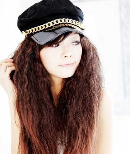 第八款,渐变染发的设计,棕红色系的自然过渡,很有辣味哦!玉米烫设计,蓬松感十足营造的厚重感,戴上一顶海军风格帽,帅气十足哦!时尚又潮流!