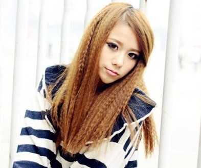第七款,洋气十足的金黄色,斜分的直发刘海,浓密细致的玉米须卷度,这样的一款中发玉米烫发型,很有个性哦!时尚又潮味十足!