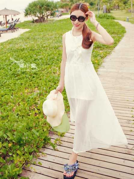 戴上一顶沙滩帽子,白色连衣裙,浓浓的女人味散发,很有魅力呢!