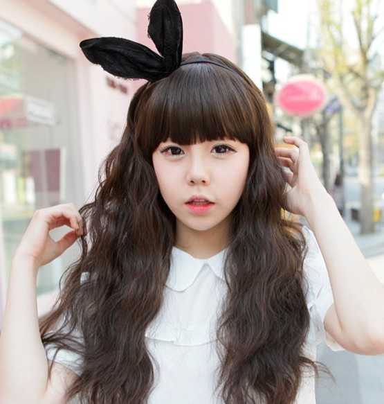 可爱小女生形象搭配唯美而不夸张的玉米烫,超不错的!碎散刘海打造出清俏丽美感,两侧的蓬松秀发十分时尚,黑色兔子形状头箍清新动人呢,可爱的MM们可以喜欢选择这款哦!
