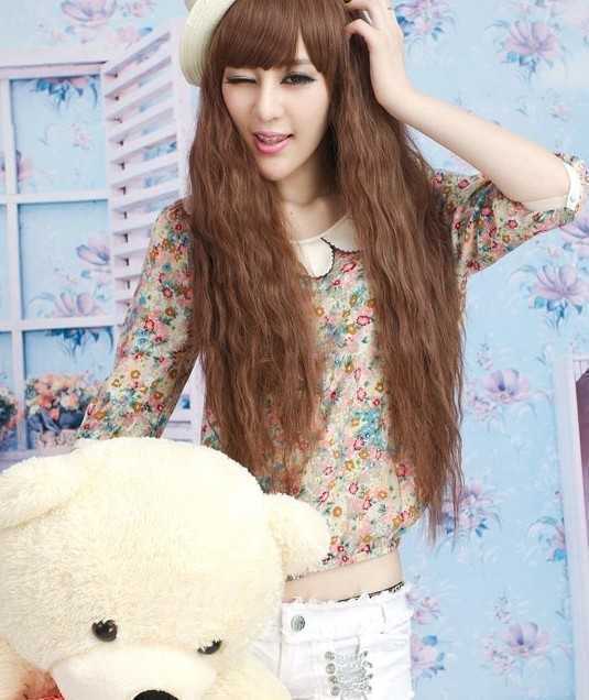 随性的玉米烫发,温和度较强的棕黄发色更让女生俏皮可爱的脸部表情尽情释放着,碎斜的刘海刚好盖过眉毛,而水灵的大眼睛自然就衬托得很好,搭配气质小碎花上衣,浓烈的唯美瓷娃娃感觉。
