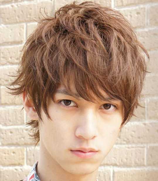 同样的烟花烫发,而这款中采用碎发斜刘海来修饰整体造型,头发带出凌乱美感,看起来十分自然随意,搭配深棕色系的染发,尽显清秀阳光大男孩的魅力。
