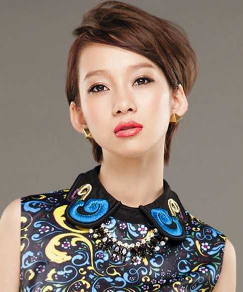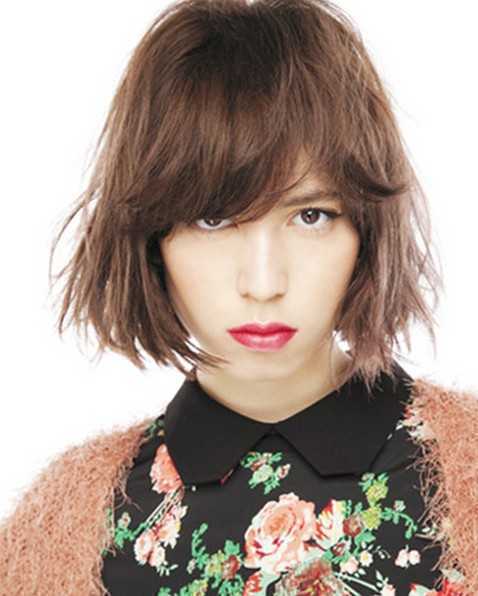 浅色系蜜糖棕色烫短头发,极具蓬松和轻盈感,稍微过长凌乱的的刘海,透出那冷艳而性感的女性魅力。