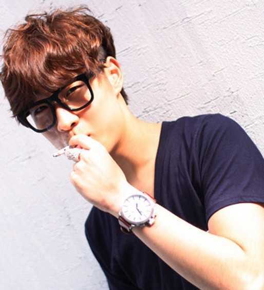 棕红的染发色低调不奢华,整款烟花烫发型打造蓬松凌乱的效果,搭配轻薄感的刘海卷曲,一副黑色眼镜框,极具时尚艺术气息,轻松打造潮男范。