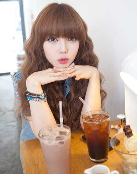 最显甜美的碎刘海长玉米烫卷发,蓬松感十足的玉米烫发丝,全部搭在肩上,不仅修脸,还添美感,染上棕色的颜色,是不是增添了时尚潮流?