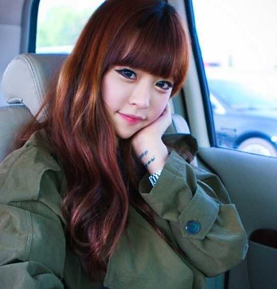 甜美可爱的韩国女生,烫卷的螺旋状发卷空气感十足,搭配红棕色的染发,衬托出红润剔透的好气色,齐刘海又是呆萌时尚哦!