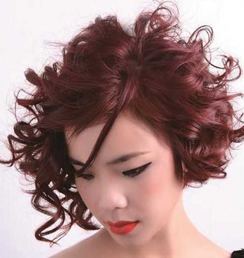 时尚的棕红色短发,结合上卷翘的烟花烫发设计,营造出绝对的蓬松感,魅惑的橘色妆容,气质韵味浓厚,动感十足。