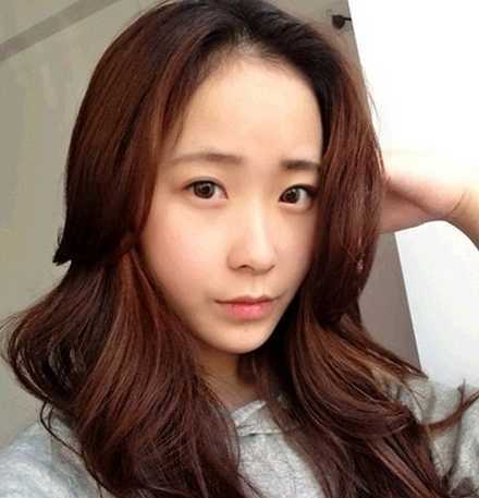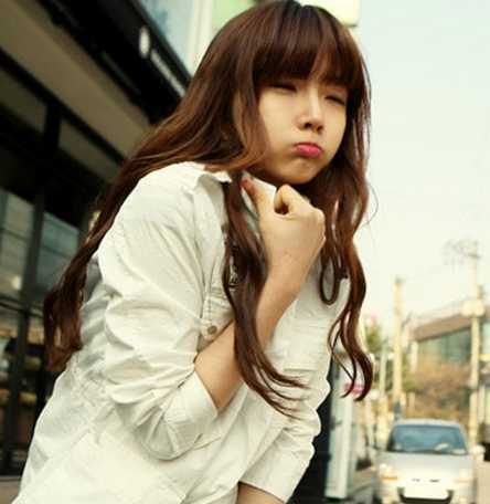 2014年最流行时尚的韩式长卷烫发,齐刘海的修剪,最能凸显甜美,卷烫的发丝随意散落,多了一份随性自然,嘟起来的小嘴,卖萌可爱。