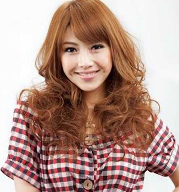 亚麻色的长发,蓬松卷卷的头发很是自然清新魅力,短斜分的刘海可爱不失甜美感觉,轻松打造出一款女生时尚的蓬松离子烫发型。