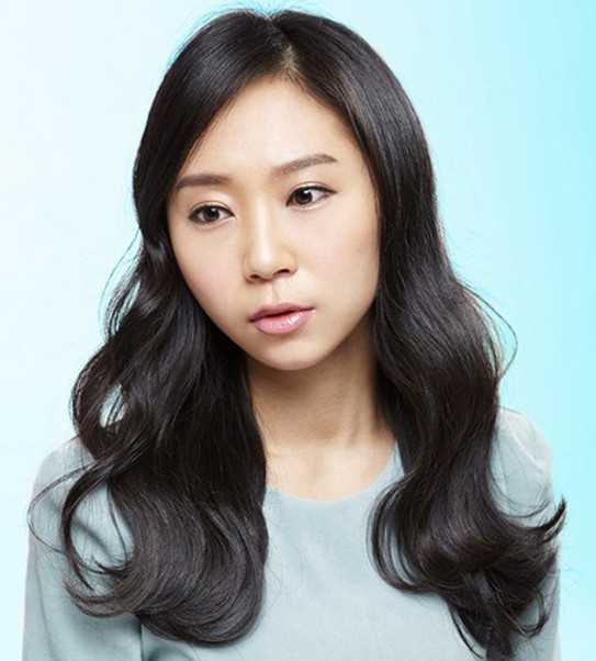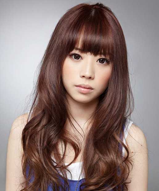 饱满的棕黑发色的长发烫发,春季尽显纯美华丽的美感,再来一个侧分的长刘海设计,能不是优雅甜美感的尽情演绎吗?