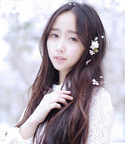 这款侧分发的长烫发型图片,突显了女生优雅和仙一般的气质,偏分的长刘海捋到耳后,配上白色花朵装饰,很有清新甜美感觉。