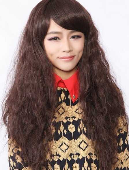 超蓬松设计的女生烟花烫发型图,细碎的长烫发,精致又显得甜美可爱,搭配顺滑感的斜刘海,修颜又十分好看。