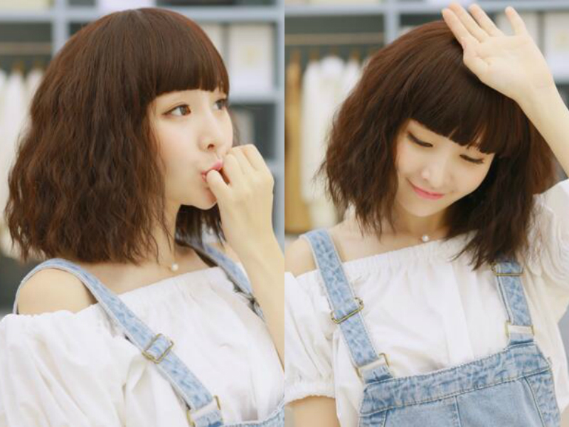 齐刘海的锡纸烫短发集时尚与可爱于一体,柔顺的直刘海与两侧卷卷的头发形成鲜明的对比,突出了一种反差美,整个发型看上去非常时髦甜美,还带点小清新的感觉呢!
