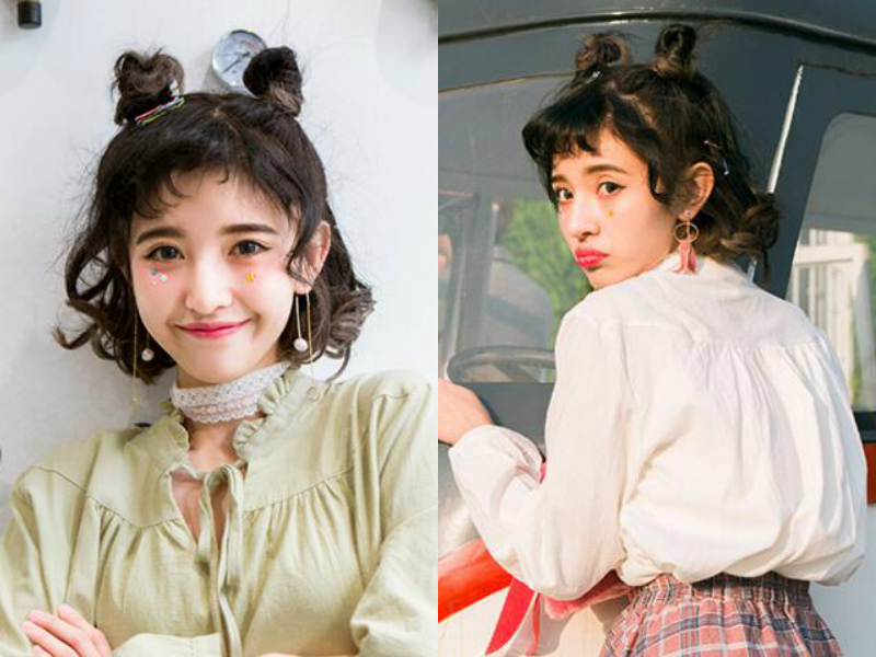 螺旋卷短烫发除了和二次元刘海相搭配之外,与狗啃式刘海的组合也不错,凌乱的刘海对额头起到修饰作用,使别人的注意力集中于女生立体的五官上,稍大螺旋状的头发设计营造出轻盈空气感来,在头顶扎上两个小丸子头,整个发型看起来随性简约,很有个性也很洋气。