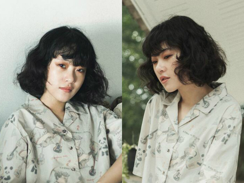 这款螺旋卷短烫发发型在经典的黑发下显得有点轻熟女感,头发纯黑浓密,烫后过于蓬松使螺旋状的弧度并不明显,两侧发丝紧贴着脸颊,使人完全看不出女生原有的脸型,能轻易达到修饰脸型的目的,有点厚重的刘海遮挡住额头,凸出女生明亮的双眸,整个人看起来清新淡雅。