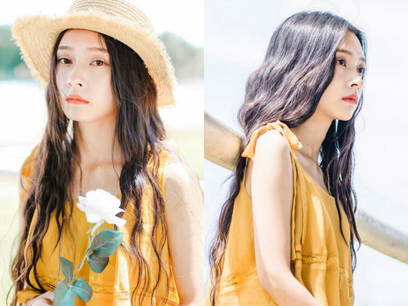 自然的黑色长发通过玉米烫的打理后照样能展现出清纯温柔的一面,中分的及腰长发如瀑布般顺垂而下,露出额头突出女生精致的五官,女生淡然的表情让人有点距离感,但学院女神不就这样吗?
