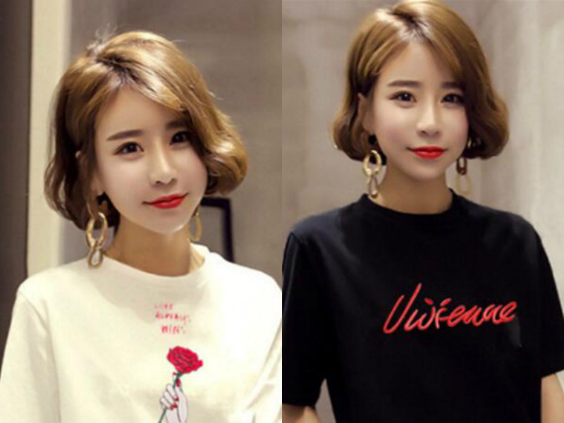 侧分的刘海稍微遮住一侧脸蛋,加上发尾烫发后向内卷起并鼓出来,更显得脸蛋小巧,棕色的染发稍显轻熟女,奈何妹子满脸的胶原蛋白,只觉得这个发型在她身上反而彰显出青春活力感。