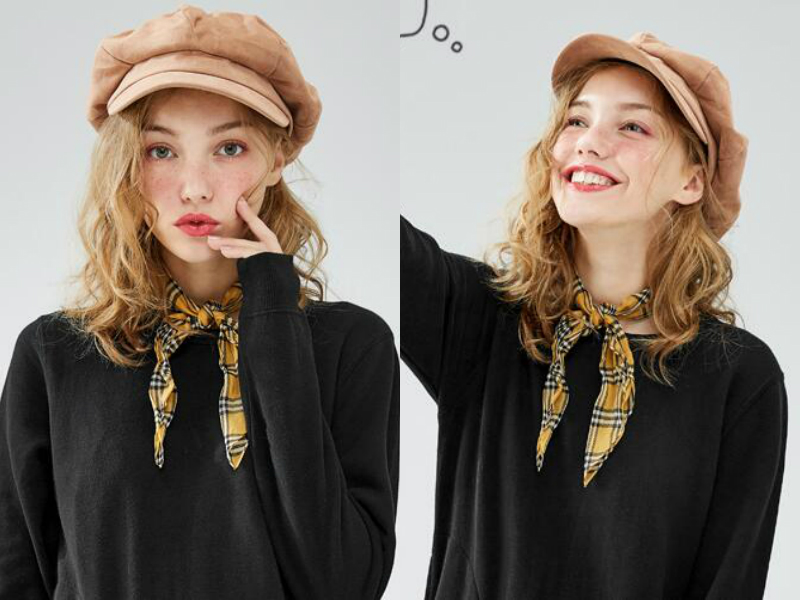 妹子一头及肩的头发经过烟花烫发后变得卷翘蓬松,金黄的发色时尚得来又充满欧美feel,刘海一侧垂下遮住侧脸,一侧则夹至耳后,再戴上一顶帽子,整个造型算是妥妥的固定住,时髦得来又很有自己的风格特色。