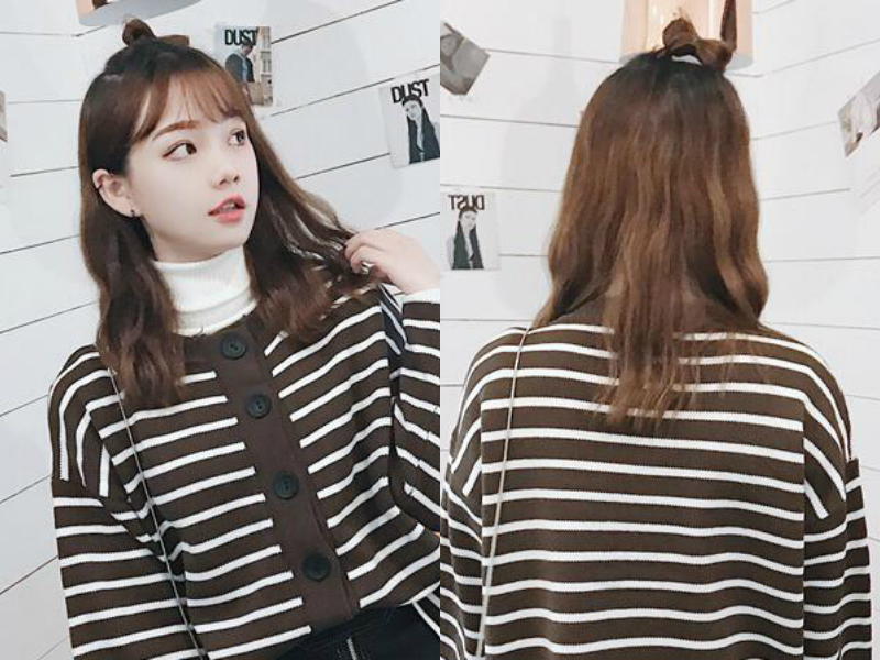 这款热烫发的程度比较轻微,发丝的弧度感很淡,不仔细看的话还真是看不出。修剪整齐的发尾轻轻贴着肩头,衬托出妹子尖细的下巴,轻柔的刘海垂放额前,再扎个俏皮的苹果头,可爱又减龄,充满少女的天真感!