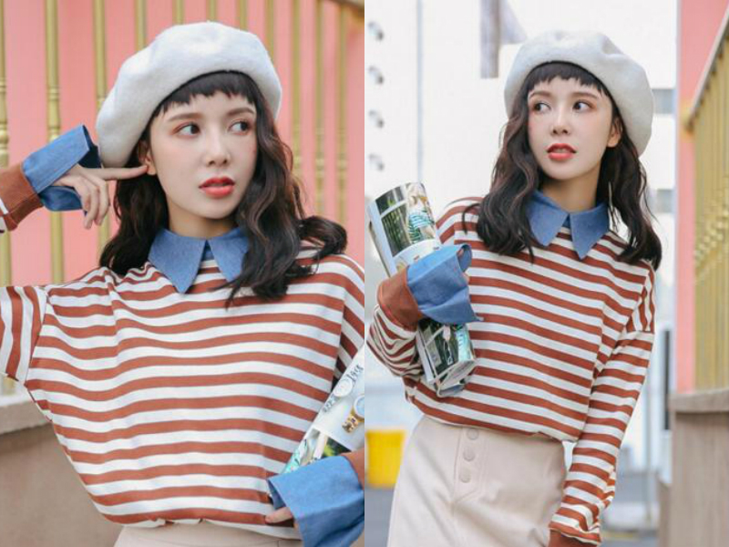 二次元的刘海修剪看起来精灵古怪,露出部分额头更突出妹子精致的五官,热烫后的头发从脸颊两侧滑落,一侧则夹至耳后,修饰脸型之余也展现妹子柔美的脸部线条,戴上一顶白色贝雷帽,仿佛带有一种名媛淑女的风范。