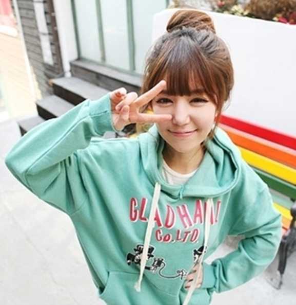 超可爱的一款,齐刘海,有点蓬松感的丸子头,搭上可爱宽松的衣服,随性自然的感觉就出来了,很显气质哦,再来一个卖萌的表情,超可爱的。