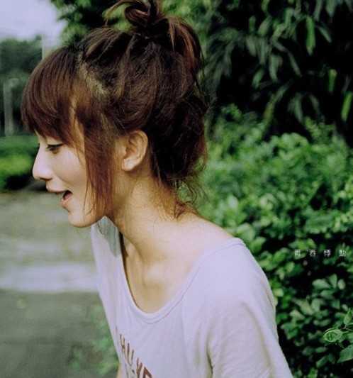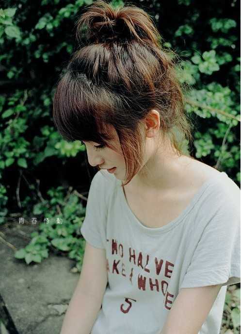 随性蓬松感的丸子头,街头风外加非主流感觉,前面碎齐刘海,两颊的几条发丝,显得清纯自然,透着几分慵懒气息,很赞哦。