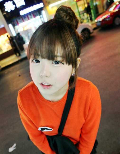 齐刘海女生显得特别可爱,绝对可以减龄的一款丸子头,超受欢迎哦,2013选一款这样的丸子头,特别可爱哦!