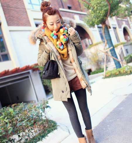 前面的刘海把它绑起来,流出了光洁额头,很清爽,后面高扎起来的蓬松丸子头,效果超不错,甜美又清纯,冬日的街头你就是最闪亮的那颗星哦!