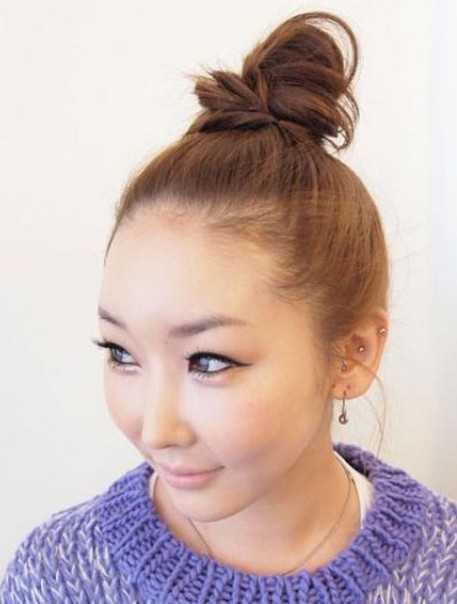 韩式风格,这款十分简单丸子头发型,全部往后梳起来的刘海,显得十分清爽哦!扎法很简单,喜欢这款丸子头的MM可以试试哦!